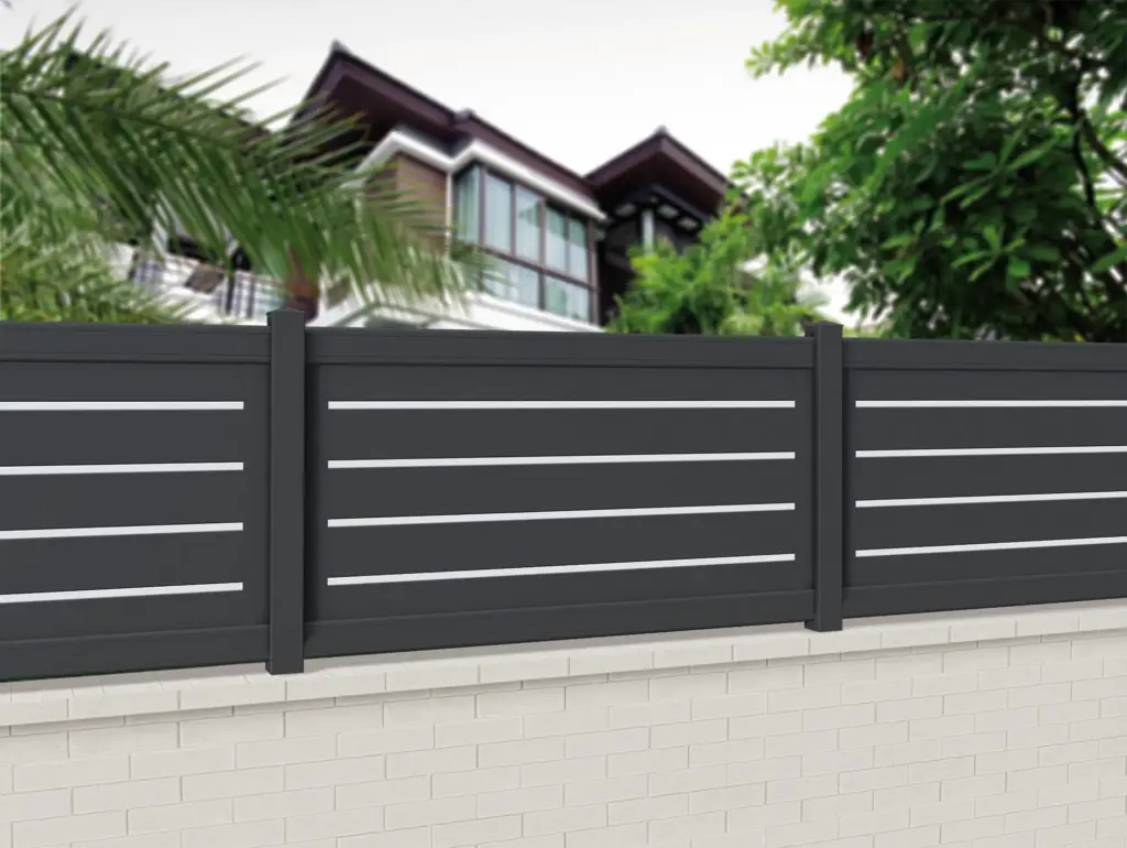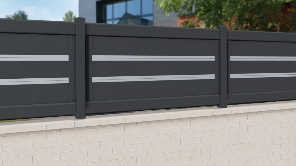 Remplissage par lames horizontales 200 x 20 mm. Profil intercalaire de 20 mm gris silver (par défaut) ou RAL standard. Clôture CL CT 32 D de type ajouré. Ce modèle au design moderne donnera une touche de caractère à votre propriété. Demander un devis Configurer